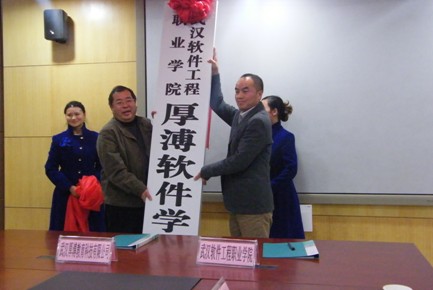 2013年12月2日下午15:00武漢厚溥教育科技有限公司與武漢軟件工程職業(yè)學院(以下簡稱武軟)在武軟實訓中心二樓會議室舉行了校企合作共建院系厚溥軟件學院揭牌儀式。