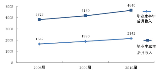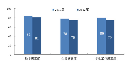 報(bào)告顯示,畢業(yè)生就業(yè)率持續(xù)上升,2013屆畢業(yè)生半年后的就業(yè)率為90.9%,比2012屆上升0.5個(gè)百分點(diǎn)。月收入持續(xù)增長,“跑贏”通貨膨脹,2013屆畢業(yè)生半年后月收入為2940元,比2012屆增長7.7%。自主創(chuàng)業(yè)比例為3.3%,比兩年前的2.2%提高了50%。畢業(yè)生專業(yè)相關(guān)度為64%,與前兩年基本持平。畢業(yè)生對母校的滿意度持續(xù)上升,2013屆的滿意度為85%,比2012屆上升2個(gè)百分點(diǎn)。(見表1)